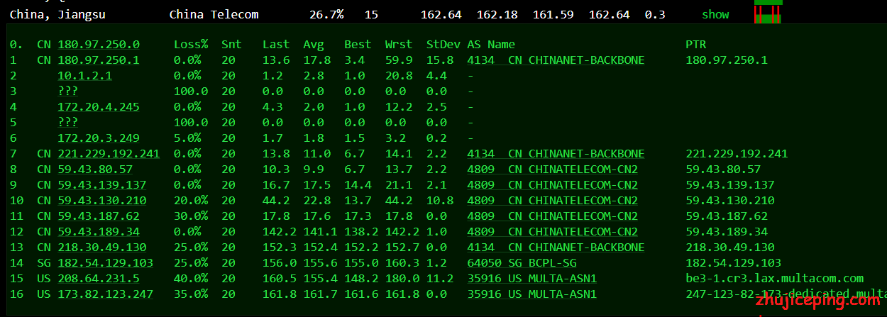 回程路由(晚高峰测试),三网都拉直了,这是绝对没有问题的!