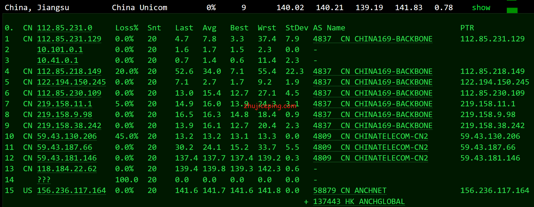 回程,到国内电信:全过了cn2,看起来服务器在安畅(?)