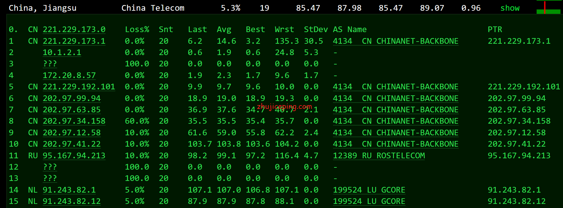 国内去程,电信骨干直连俄罗斯国家电信运营商rostelecom(拥有俄罗斯最大的国内骨干网),联通骨干直接接俄罗斯顶级电信运营商transtelecom,移动走的是megafon(俄罗斯第二大移动运营商第三大电信运行商)但是绕道了德国: