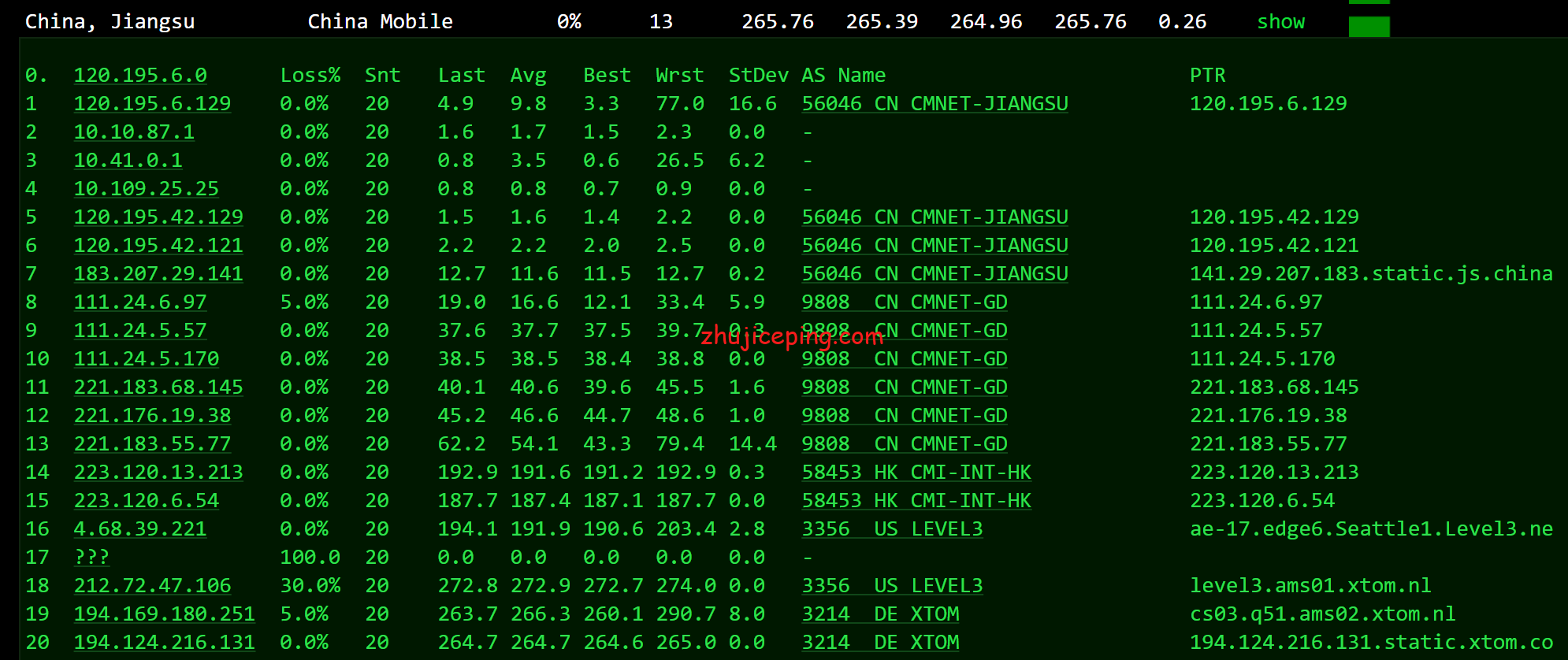 国内移动去程,香港CMI对接美国西雅图level3然后去荷兰: