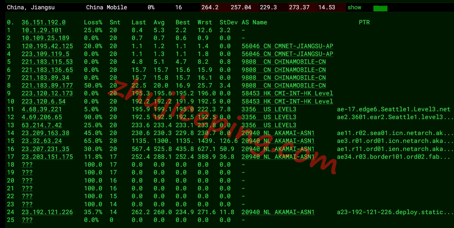 移动去程:直连移动西雅图节点然后走level3再转akamai去机房